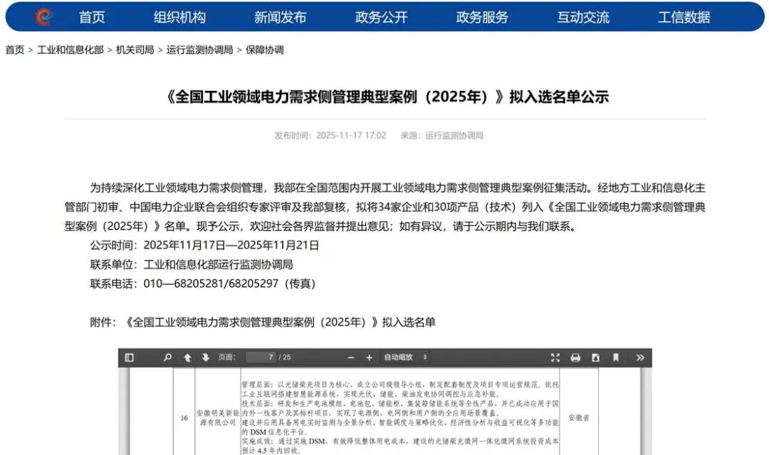 中國儲能網(wǎng)訊:近日,工業(yè)和信息化部對《全國工業(yè)領(lǐng)域電力需求側(cè)管理典型案例(2025年)》擬入選名單進(jìn)行公示,安徽明美新能憑借其創(chuàng)新的光儲智能微網(wǎng)系統(tǒng)成功入選。此次入選國家級名單,標(biāo)志其在工業(yè)能源管理領(lǐng)域的技術(shù)先進(jìn)性與實踐成效獲得了權(quán)威認(rèn)可。