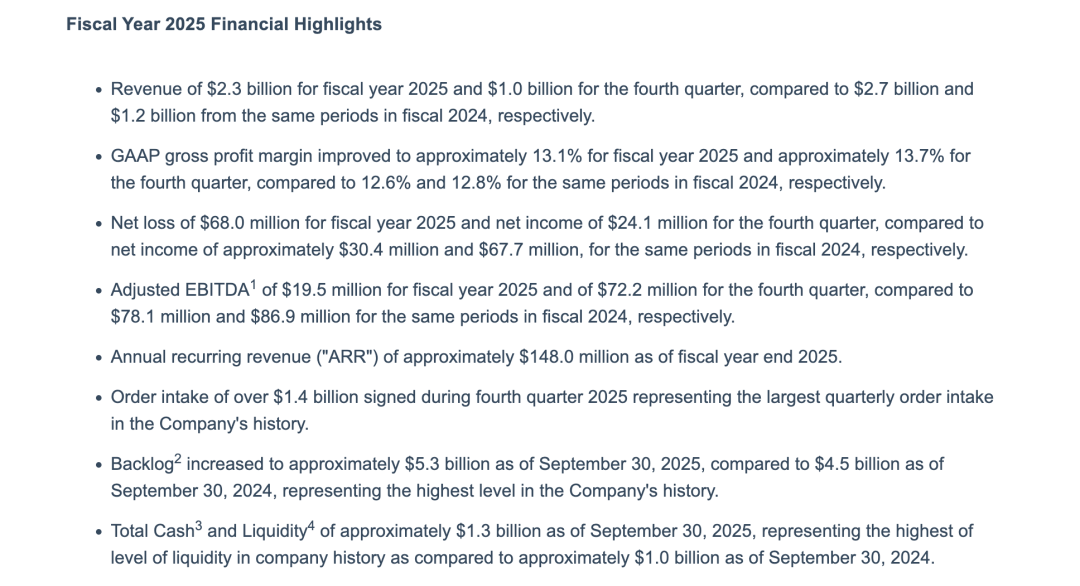 從數(shù)據(jù)上看,F(xiàn)luence 的項(xiàng)目交付量仍在增長(zhǎng)。公司在2025財(cái)年第四季度簽訂新訂單14億美元,創(chuàng)下單季紀(jì)錄。但盡管項(xiàng)目數(shù)量上升,利潤(rùn)卻下滑(2025財(cái)年凈虧損6800萬美元),說明單項(xiàng)目收入(ASP)出現(xiàn)下行。