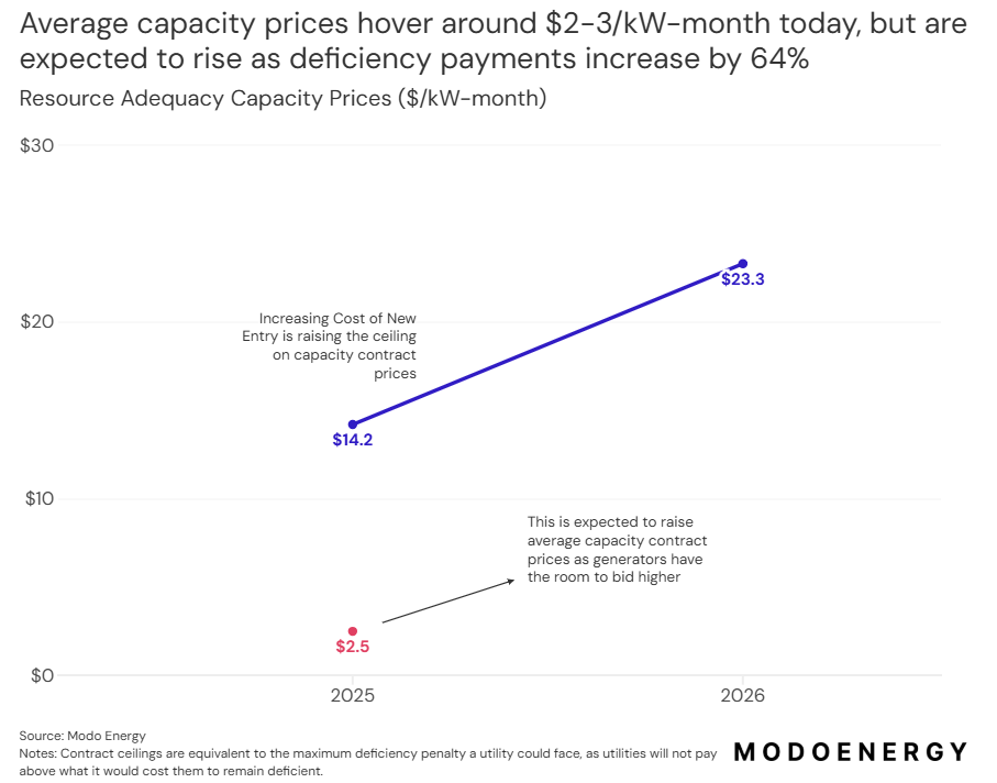 2026年,考慮到新建燃?xì)廨啓C(jī)成本的增加,該參考CONE預(yù)計(jì)將從85.61美元/千瓦-年提高到139.85美元/千瓦-年。這意味著最高罰金(設(shè)定為CONE的兩倍)將上漲64%,從171美元/千瓦-年(14.2美元/千瓦-月)提高到280美元/千瓦-年(23.3美元/千瓦-月)。