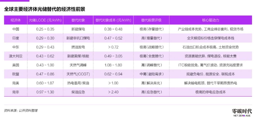 與此同時,在印度和南非等新興市場,光儲要么擊穿了新建煤電的成本線,要么成為替代昂貴柴油發(fā)電的最佳選項。光伏和儲能的成本下降正在讓光儲替代從“政策推動”全面轉(zhuǎn)入“利潤驅(qū)動”時代。
