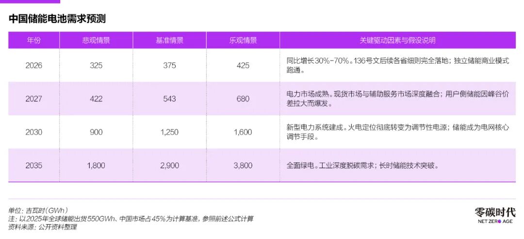 預測中最關鍵的變量是配儲時長,隨著風光發(fā)電量占比提高,電網(wǎng)對長時儲能的需求將顯著增加?;鶞是榫凹僭O平均配儲時長將從2025年的2.2小時逐步提升至2030年的3.5小時和2035年的4小時以上,這將對電池總?cè)萘啃枨螽a(chǎn)生乘數(shù)效應。