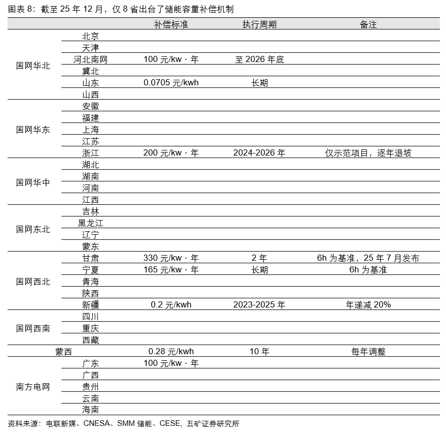 2) 內(nèi)蒙、山東、新疆、河北等省份已建立儲能容量補(bǔ)償機(jī)制,未來預(yù)計(jì)其余省份也將陸續(xù)推出。