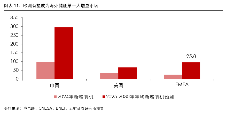 我們預(yù)計(jì)EMEA地區(qū)2025-2030年年均裝機(jī)有望達(dá)到95.8GWh,歐洲有望超越美國成為海外儲能第一大增量市場,2026年應(yīng)重點(diǎn)關(guān)注。