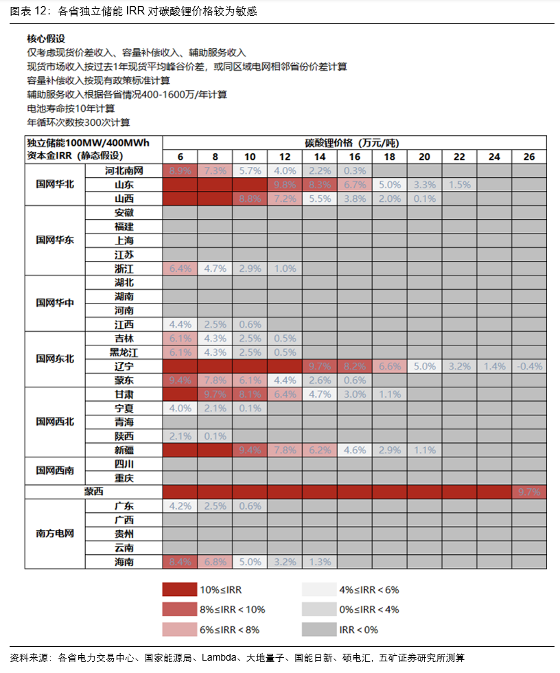碳酸鋰價格下降和電力現(xiàn)貨市場啟動,是帶動儲能度電成本快速下降的兩大核心變量。在理想利用率下,鋰電儲能度電成本有望達(dá)到0.4元/kwh水平,結(jié)合現(xiàn)貨峰谷價差水平和潛在的容量補(bǔ)償收入預(yù)期,部分省份部分節(jié)點(diǎn)的獨(dú)立儲能項(xiàng)目IRR可以滿足五大六小發(fā)電集團(tuán)的收益率要求。