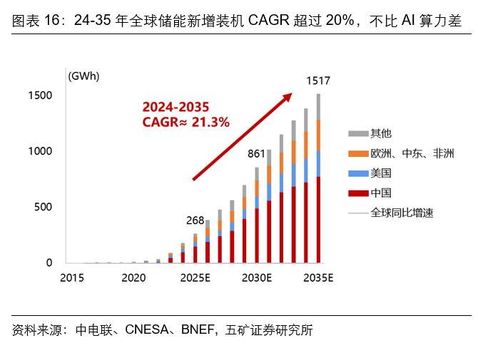 2024-2035年全球儲能新增裝機(jī)CAGR約21.3%,在千億規(guī)模量級行業(yè)中,成長軌跡明確,前景可觀。