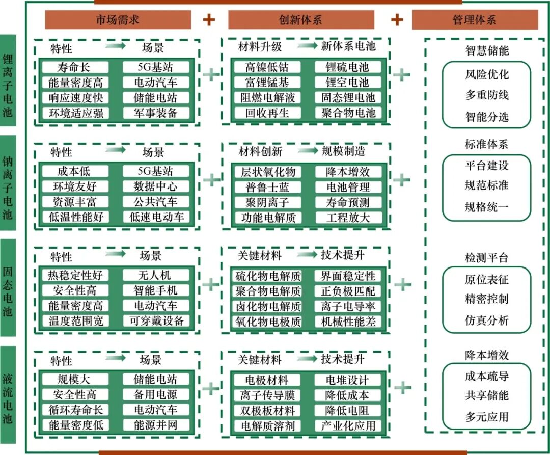 關(guān)鍵材料研究是發(fā)展電化學(xué)儲能技術(shù)的基礎(chǔ)。當(dāng)前的儲能材料研發(fā)高度依賴研究者的“嘗試法”實驗、積累經(jīng)驗與科學(xué)直覺,實驗室研究也無法滿足各類應(yīng)用場景對儲能器件能量密度、功率密度、循環(huán)壽命的需求。需要采取由應(yīng)用驅(qū)動的“逆向思維”來設(shè)計材料結(jié)構(gòu)。發(fā)揮大數(shù)據(jù)、人工智能技術(shù)對相關(guān)模擬計算的賦能作用,面向各類具體應(yīng)用場景,針對性開展儲能系統(tǒng)、儲能器件、關(guān)鍵材料設(shè)計并挖掘有效組合;以基礎(chǔ)技術(shù)創(chuàng)新提高電池材料和組件的研發(fā)水平,促進電池的優(yōu)質(zhì)制造與規(guī)?;渴?。在工業(yè)應(yīng)用背景下開展相關(guān)基礎(chǔ)研究,立足現(xiàn)實條件對新材料及組件技術(shù)進行交叉驗證,加快確定科學(xué)的選材方向以加速推動電池技術(shù)演進。