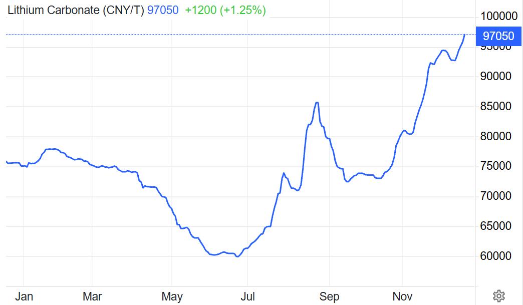 受此消息影響,碳酸鋰期貨市場(chǎng)反應(yīng)劇烈。截至12月15日,碳酸鋰加權(quán)合約單日涌入超過(guò)13億元資金,主力合約持倉(cāng)量突破66萬(wàn)手,創(chuàng)下歷史新高。與6月下旬的年內(nèi)低點(diǎn)相比,碳酸鋰價(jià)格漲幅已超過(guò)70%,市場(chǎng)情緒明顯亢奮。