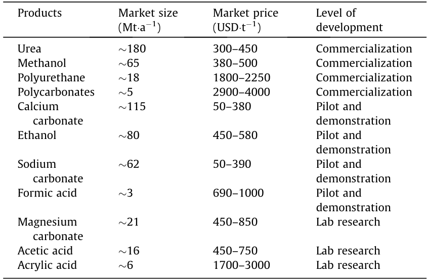表2 典型化學品的市場情況以及CO2衍生技術(shù)的開發(fā)水平