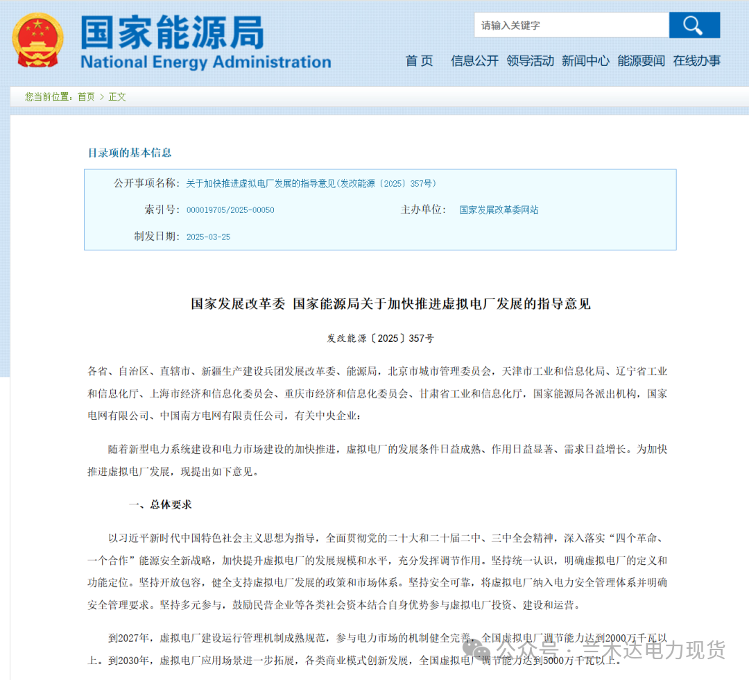2025年3月25日,國家能源局發(fā)布了文件《關(guān)于加快推進(jìn)虛擬電廠發(fā)展的指導(dǎo)意見(發(fā)改能源〔2025〕357號)》,明確虛擬電廠總體定位與發(fā)展目標(biāo)。文件提出:到2027年,全國虛擬電廠調(diào)節(jié)能力達(dá)到2000萬千瓦以上;到2030年達(dá)到5000萬千瓦以上。該目標(biāo)基于對新能源發(fā)展態(tài)勢的精準(zhǔn)研判,同時確立虛擬電廠在新型電力系統(tǒng)中的四大定位:一是電力平衡的重要參與者;二是電網(wǎng)靈活調(diào)節(jié)能力的重要提供者;三是分布式電源價值實現(xiàn)的重要載體;四是電力市場創(chuàng)新的重要試驗田;為各省區(qū)制定實施細(xì)則提供了根本遵循。