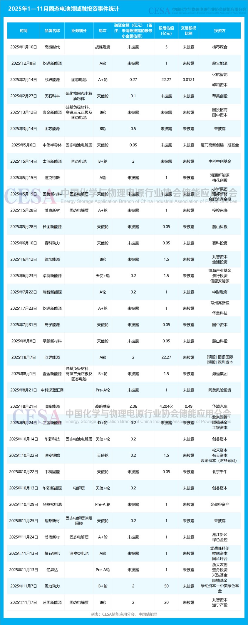 據(jù)CESA儲能應(yīng)用分會產(chǎn)業(yè)數(shù)據(jù)庫不完全統(tǒng)計,僅2025年1—11月底資本市場就發(fā)生了圍繞固態(tài)電池領(lǐng)域的融投資事件35起,已披露的融投資12.38億元,覆蓋天使輪、A輪、B輪、戰(zhàn)略融資等多個輪次。