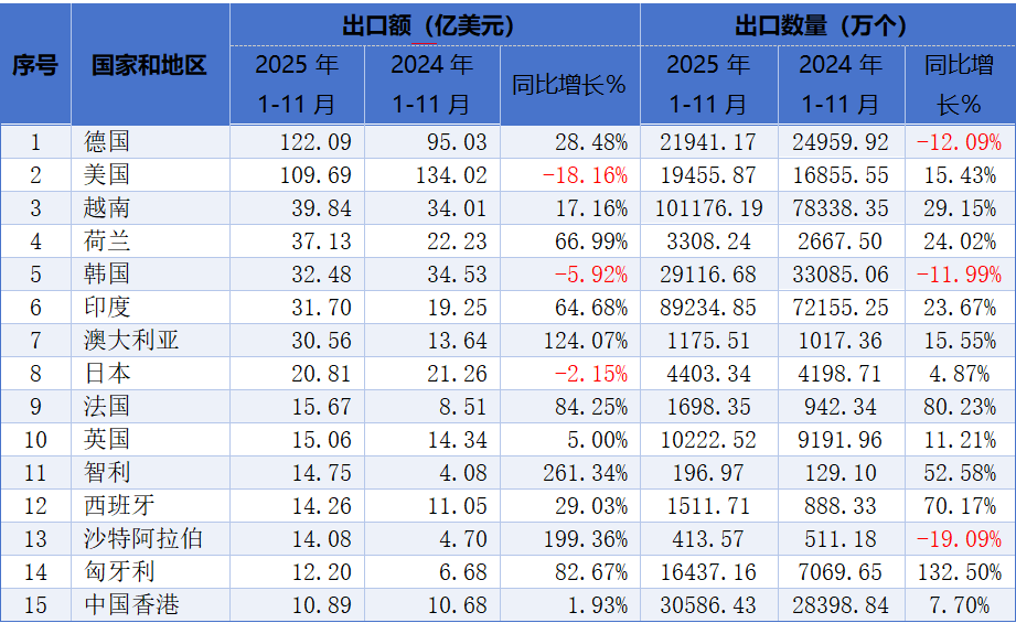 德國從5月份開始已經(jīng)取代美國成為我國鋰離子電池第一大出口市場,2025年1-11月出口金額為122.09億美元,同比增長28.48%,占我國鋰離子出口總額的17.7%。第二大市場為美國,1-11月出口總金額為109.69億美元,同比下降18.16%,占我國鋰離子電池出口額的15.9%。越南為第三大出口市場,出口金額為35.84億美元,同比增長17.16%,占我國鋰離子電池出口額的5.2%。前十大出口國家中,同比增幅最大的國家分別為智利、沙特阿拉伯、澳大利亞。