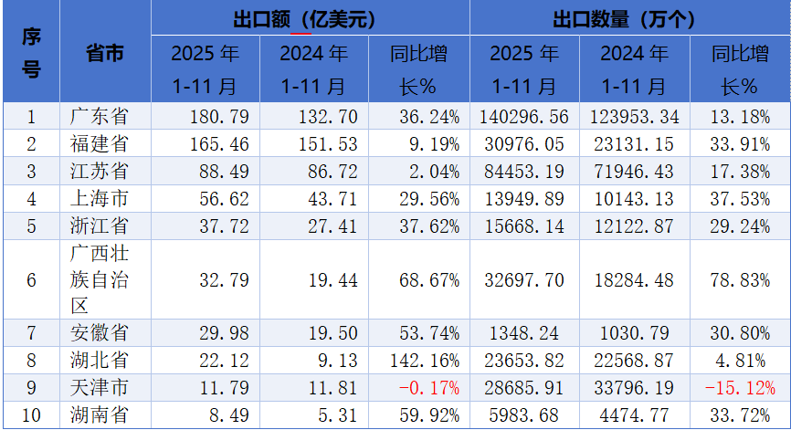 2025年1-11月前十大出口地,其中金額增幅最大的三個省分別是湖北省、廣西壯族自治區(qū)、湖南省,出口額分別增長142.16%、68.67%、59.92%。出口數(shù)量增幅最大的三個省市分別為廣西壯族自治區(qū)、上海市、福建省,出口數(shù)量分別增長了78.83%、37.53%、33.91%。
