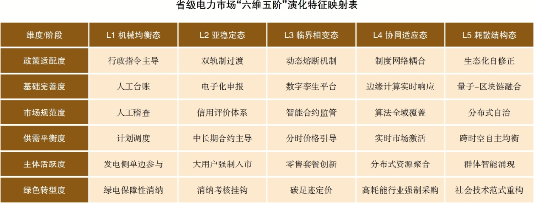 基于復(fù)雜適應(yīng)系統(tǒng)理論的適應(yīng)性循環(huán)與相變閾值機(jī)制,系統(tǒng)呈現(xiàn)六維度在五階段的具體演化特征如表所示。該表可直觀反映各維度隨市場成熟度梯度提升的動(dòng)態(tài)變化規(guī)律,為省級(jí)電力市場建設(shè)的階段定位、短板識(shí)別及差異化政策制定提供可視化支撐。