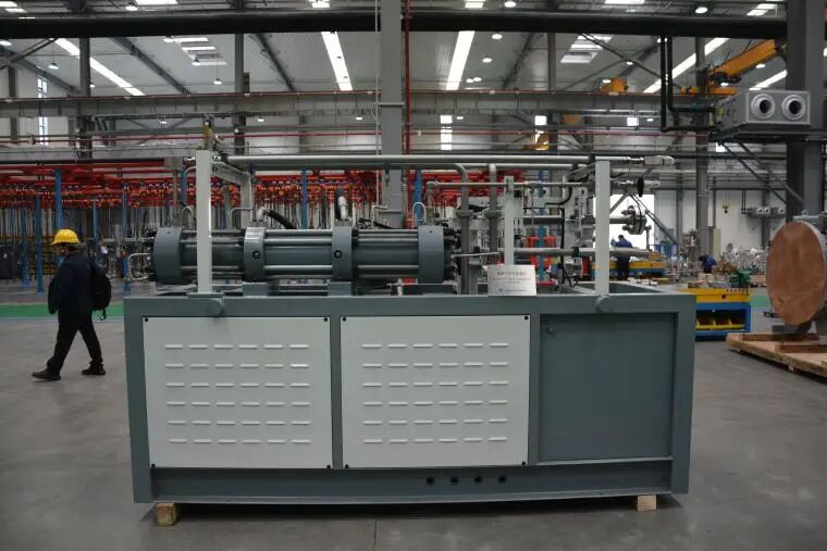 全釩液流電池電堆是儲能系統(tǒng)的“ 動力心臟”。據(jù)車間工作人員介紹,杭氧研發(fā)的42kW全釩液流電池電堆能量效率大于82%,性能優(yōu)異且運行穩(wěn)定,處于行業(yè)先進水平,可應(yīng)用于新能源發(fā)電側(cè)儲能、電廠的調(diào)峰調(diào)頻等領(lǐng)域。氫液化透平膨脹機是獲取深低溫冷量的核心部件。“我們創(chuàng)新研發(fā)的氫液化透平膨脹機采用多級串聯(lián)方式進行布局,車間內(nèi)展示的為第一級膨脹機,可在大于10萬rpm的超高轉(zhuǎn)速下穩(wěn)定運行,并且能夠適應(yīng)高壓、25K深低溫的嚴苛氫氣環(huán)境,在確保機組零泄漏的同時,能有效抑制熱傳導(dǎo)損失?!避囬g一位技術(shù)人員告訴記者。