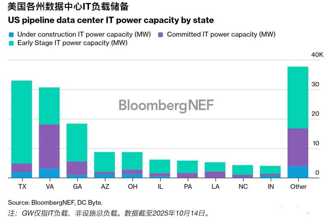 美國(guó)數(shù)據(jù)中心IT負(fù)載儲(chǔ)備排名前十的州合計(jì)占比