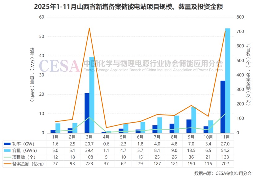 從全年來(lái)看,2025年1-11月,山西新增備案共計(jì)409個(gè)儲(chǔ)能電站項(xiàng)目,總規(guī)模高達(dá)75.7GW/152.4GWh,僅次于山東,位居全國(guó)第二,新增備案投資金額達(dá)2327億元,顯示出山西儲(chǔ)能市場(chǎng)的高景氣度與投資熱情。
