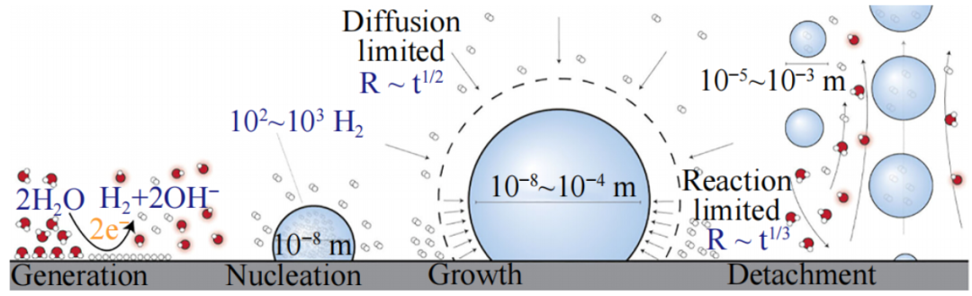 美國(guó)俄勒岡大學(xué)化學(xué)與生物化學(xué)系Paul A.Kempler團(tuán)隊(duì)在Chemical Reviews中的研究指出,電解水過(guò)程中析氫反應(yīng)和析氧反應(yīng)產(chǎn)生的氣泡會(huì)影響制氫的能量轉(zhuǎn)換效率。其工作也概述了氣泡生命周期中發(fā)生的物理過(guò)程,如圖4所示。