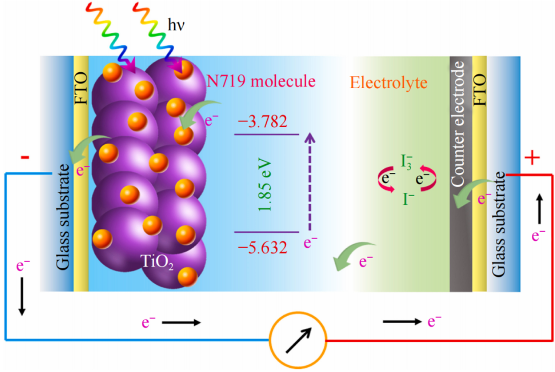 染料敏化太陽(yáng)能電池為利用植物光合作用激發(fā)的太陽(yáng)能提供了一種很有前途的創(chuàng)新方法,研究主要集中在低成本、卓越的透明度、可持續(xù)性和簡(jiǎn)單的制造工藝上,工作原理如圖6所示。