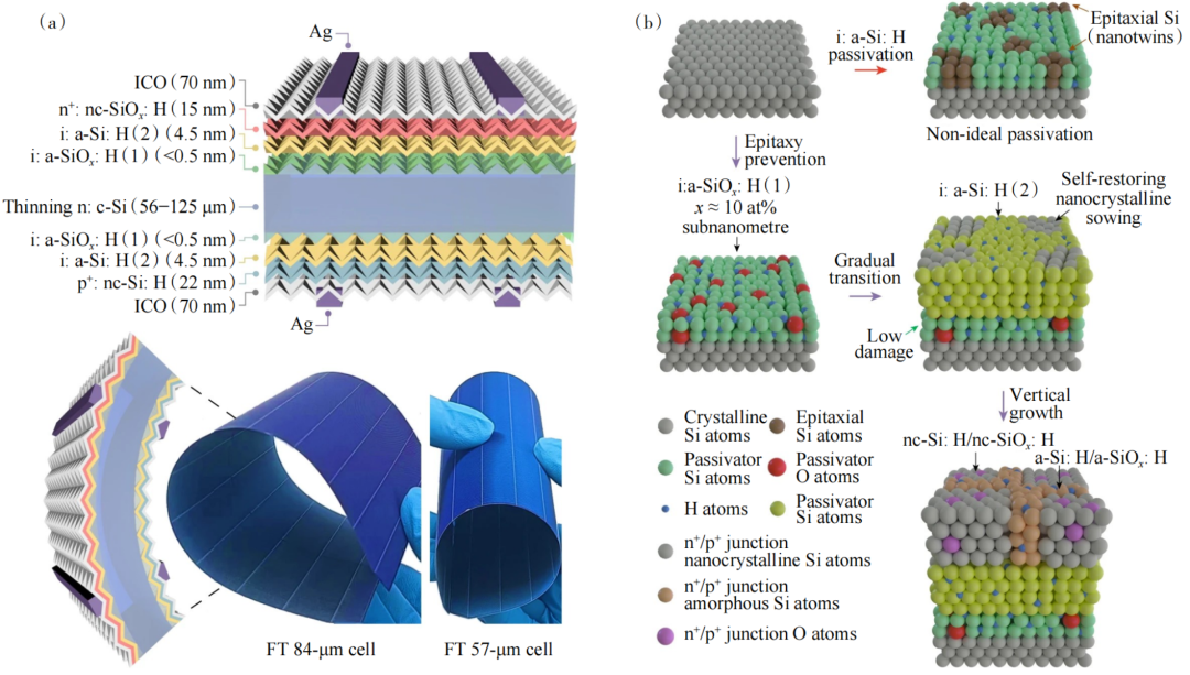 江蘇科技大學(xué)李陽(yáng)團(tuán)隊(duì)在Nature中的研究指出為避免外延,采用低損傷連續(xù)等離子體化學(xué)氣相沉積策略,成功制造出不同厚度(55~130 μm)的高性能電池。以“超薄、柔性”晶硅異質(zhì)結(jié)太陽(yáng)能電池的優(yōu)勢(shì),其結(jié)構(gòu)與工藝示意如圖7所示,使得用于旅行的彎曲或卷起晶體硅太陽(yáng)能電池指日可待。