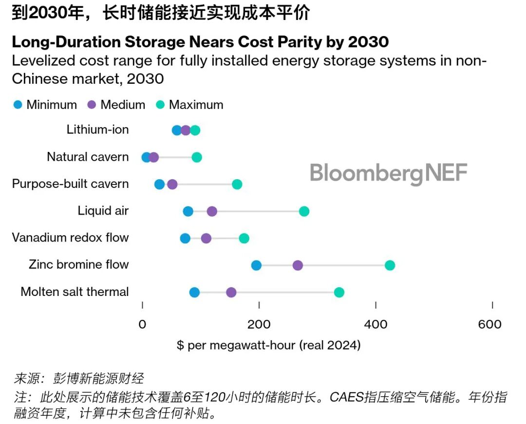 長時儲能(LDES)對構(gòu)建可靠、經(jīng)濟(jì)且以可再生能源為主導(dǎo)的凈零電力系統(tǒng)至關(guān)重要。本報告基于彭博新能源財經(jīng)的首份《長時儲能成本調(diào)研報告》,分析了主要長時儲能技術(shù)的平準(zhǔn)化儲能成本(LCOS)。壓縮空氣儲能作為高性價比技術(shù)脫穎而出,在特定條件下具備與鋰離子電池儲能及脫碳的開式循環(huán)燃?xì)廨啓C(jī)競爭的潛力。熔鹽儲熱技術(shù)在中國市場同樣展現(xiàn)出一些成本優(yōu)勢。