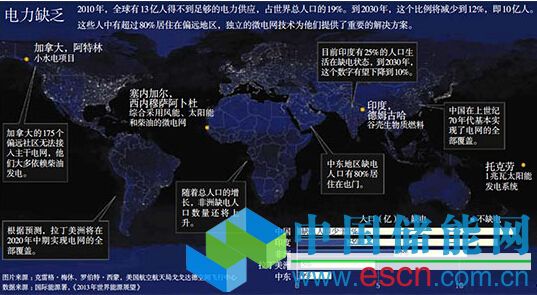 在西半球電氣化程度最低的國(guó)家——海地,部分居民每月需要花費(fèi)10美元購(gòu)買蠟燭和煤油,用做家庭照明,這大概是美國(guó)普通家庭同類支出的125倍。許多印度居民需要支付額外費(fèi)用,才能通過(guò)汽車電池為手機(jī)充電。在非洲,日光仍然是數(shù)百萬(wàn)當(dāng)?shù)鼐用竦闹饕彰鞣绞?。一些太平洋島嶼為滿足電力需求,不得不花費(fèi)額外費(fèi)用使用柴油發(fā)電機(jī)。目前,全球約有13億人無(wú)法獲得足夠的生活用電,雖然電網(wǎng)也在不斷擴(kuò)展,但與很多人仍相距遙遠(yuǎn)。
