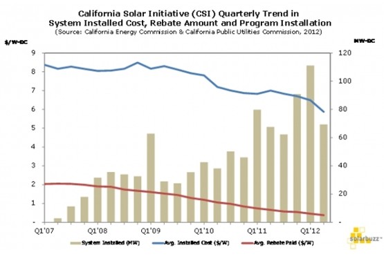 加州太陽(yáng)能計(jì)劃里的平均補(bǔ)貼金額,從2007年第一季度的$2.03/W下降到2012年第二季度的$0.38/W,占系統(tǒng)安裝成本的比例則從25%下降到僅6%。