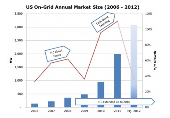 類似地,聯(lián)邦現(xiàn)金補(bǔ)助法案的到期在2011年底導(dǎo)致一波安裝量的激增,以便能取得補(bǔ)貼的合法資格。目前預(yù)期在2012年市場(chǎng)的增速會(huì)再次放緩。