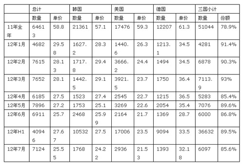 從分國(guó)別數(shù)據(jù)來(lái)看,7月份,從韓國(guó)、美國(guó)、德國(guó)三國(guó)進(jìn)口量占全部進(jìn)口量的85.6%,其中,韓國(guó)的市場(chǎng)份額為24.8%;美國(guó)的市場(chǎng)份額為41.2%;德國(guó)的市場(chǎng)份額為19.6%。同時(shí),韓國(guó)、美國(guó)的進(jìn)口單價(jià)較6月份都出現(xiàn)不同的下滑,分別為24.22美元/千克和21.53美元/千克;而德國(guó)的進(jìn)口單價(jià)小幅回升,為32.18美元/千克。