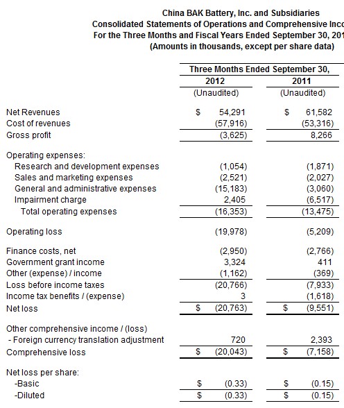 根據(jù)財(cái)報(bào)顯示,比克電池實(shí)現(xiàn)營(yíng)收5510萬(wàn)美元,環(huán)比增長(zhǎng)17.8%,同比降低10.6%。公司毛虧損360萬(wàn)美元,上一季度毛虧損510萬(wàn)美元,去年同期毛利潤(rùn)830萬(wàn)美元。同比毛利潤(rùn)轉(zhuǎn)虧的主要原因在于prismatic產(chǎn)品的銷量和毛利降低,此外庫(kù)存計(jì)提顯著增加。運(yùn)營(yíng)虧損2000萬(wàn)美元,上一季度為運(yùn)營(yíng)虧損2450萬(wàn)美元,去年同期運(yùn)營(yíng)虧損520萬(wàn)美元。凈虧損2080萬(wàn)美元,或每股虧損0.33美元,上一季度為凈虧損2760萬(wàn)美元或每股虧損0.44美元,去年同期為凈虧損960萬(wàn)美元,或每股虧損0.15美元。截至2012年9月30日,比克電池共有現(xiàn)金和現(xiàn)金等價(jià)物930萬(wàn)美元。