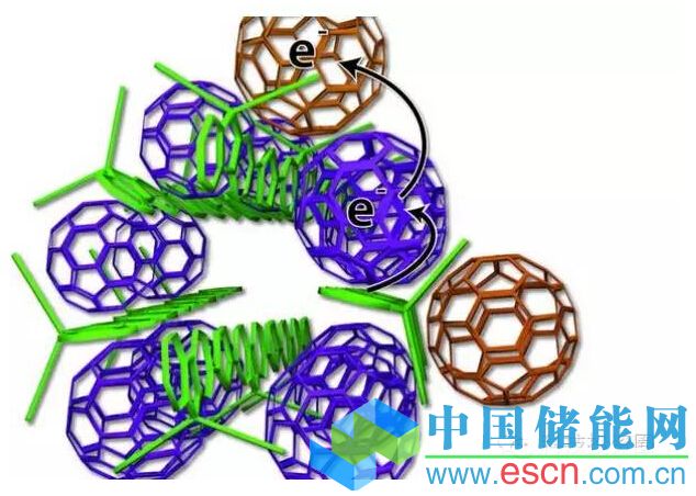 聚合物給體能夠吸收陽光并將電子傳遞給富勒烯,電能就是在這個過程中產(chǎn)生的。被稱為有機光伏的塑料材料的結(jié)構(gòu)通常像一盤煮過的意面那樣無序。細(xì)長的聚合物給體就像“意面”,富勒烯就像“肉丸”。這樣的結(jié)構(gòu)使得電流很難流出電池,因為有時電子會彈回聚合物“意面”后消失。新技術(shù)將這些成分有序排列——就像一把生意面和精確穿插其中的肉丸一樣。一些富勒烯“肉丸”在聚合物給體形成的環(huán)抱中,另一些則在外側(cè)。環(huán)抱中的富勒烯將電子從聚合物中分離然后“丟”給外側(cè)的富勒烯。