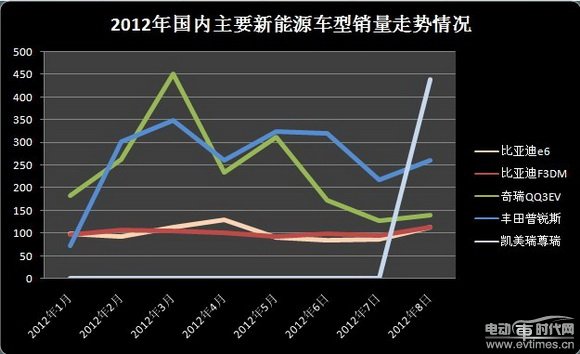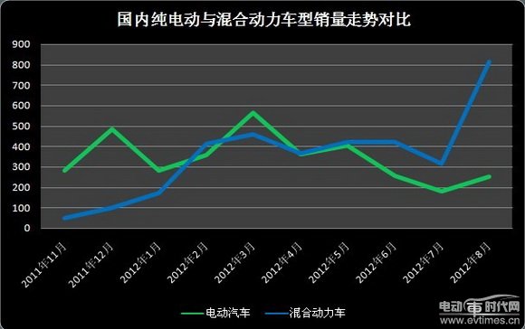 電動汽車時代網(wǎng)援引中國汽車工業(yè)協(xié)會數(shù)據(jù)統(tǒng)計得知,2012年8月份,國內(nèi)五個主要新能源汽車品牌(不含進口車)共售出1065輛,其中純電驅動轎車253臺,混合動力轎車售出812臺(分別來自豐田汽車的兩個合資品牌——一汽豐田和廣汽豐田)。純電動車與混動車銷售數(shù)字的此消彼長,實際上也是產(chǎn)業(yè)發(fā)展大轉向的生動體現(xiàn)。