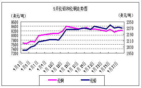 9月份,倫銅總體上以震蕩上行而后高位小幅回落為主,中旬以前受助于量化寬松推動,節(jié)節(jié)攀升,最高漲幅達(dá)10.3%;不過下旬以后因其自身基本面不足開始展開高位回調(diào),幅度2.1%,總體上,偏好情緒為主基調(diào)。但是中國需求不是很樂觀,對銅價(jià)長效支撐不夠,因此,高位回落乃勢在必然。另外,投機(jī)資金高位繼續(xù)撤離銅市,因此對整個(gè)金屬市場人氣的影響稍微不利。銅價(jià)10月能否維持較強(qiáng)走勢關(guān)鍵還在于需求前景,另外,中日最近升級的釣魚島事件或?qū)︺~需求構(gòu)成不利,且需密切關(guān)注10月公布的重要經(jīng)濟(jì)數(shù)據(jù)對其影響。