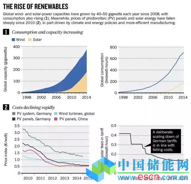 在我們看來(lái),最有可能結(jié)束這一僵局的方法是協(xié)調(diào)各種政策,從而比過(guò)去5年更快更大幅度地降低可再生能源發(fā)電的成本。晶體硅光伏發(fā)電組件的成本自1978年以來(lái)已經(jīng)下降了99%,自2008年以來(lái)也已經(jīng)下降了80%;風(fēng)力發(fā)電的安裝成本也已經(jīng)大幅下降,光伏和風(fēng)力發(fā)電的裝機(jī)容量已經(jīng)取得了驚人的增長(zhǎng)(見“可再生能源的興起”)。可再生能源發(fā)電的價(jià)格會(huì)繼續(xù)下降,但如果沒有額外的幫助,下降速度將不足以快到對(duì)氣候問題產(chǎn)生實(shí)質(zhì)性的效果。