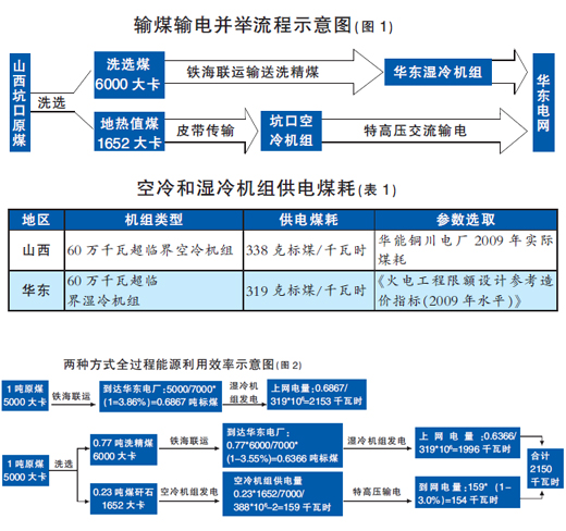 晉陜蒙寧新是我國主要的煤炭送端地區(qū)。研究表明,即使考慮到送端空冷機組煤耗相對較高,鐵海聯(lián)運輸煤和輸煤輸電并舉的全程能源利用效率仍基本相當。以山西——華東沿海為例分析如下。