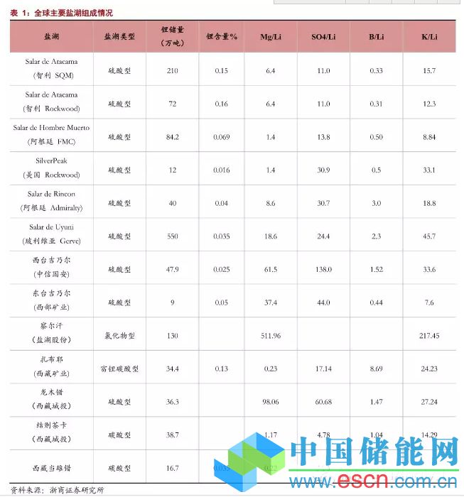 . 從鋰資源形態(tài)來分,全球的鋰資源的70%以上儲藏于南美和我國的鹽湖鹵水中,而我國71%的鋰資源存在于青海和西藏的鹽湖之中,特別是青海鹽湖中的鋰資源占到我國鋰儲量的一半以上。表1列出了世界上代表性鹽湖和正在開發(fā)鹽湖的主要數(shù)據(jù)。