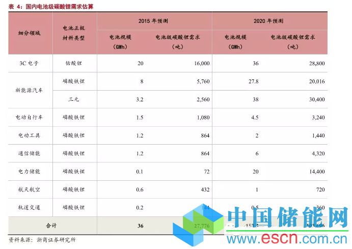 . 在浙商證券《儲能行業(yè)報告1:國內(nèi)供需尚不平衡,鋰價仍有上漲空間》(20151121)中,我們認為,電池級碳酸鋰需求將是未來的爆發(fā)點,如表4所示,預(yù)計在3C電子、新能源汽車、電力通信儲能市場增長帶動下,2015年電池級碳酸鋰需求約為2.78萬噸,2020年將超過10萬噸;總量上,2015年碳酸鋰需求約7.4萬噸,2016年有望達到10萬噸,2020年可能接近18萬噸,可見,未來5年碳酸鋰的需求量將保持年均20%左右的復(fù)合增速。