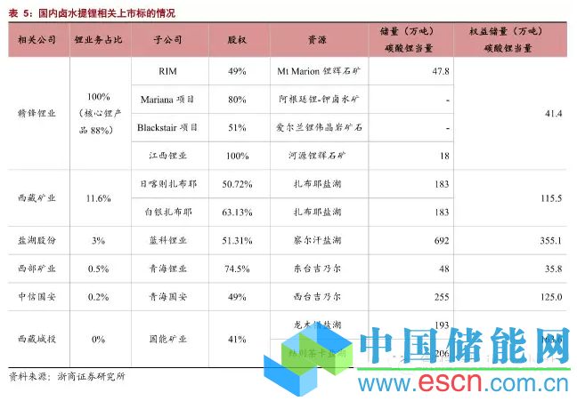 . 鹵水提鋰相關(guān)上市標(biāo)的如表5所示,從權(quán)益儲量上看,鹽湖股份、西藏城投居前;從鋰業(yè)務(wù)占比上看,贛鋒鋰業(yè)、西藏礦業(yè)居前,鹽湖股份因涉及多種有色金屬業(yè)務(wù),鋰業(yè)務(wù)對其業(yè)績彈性影響不大。