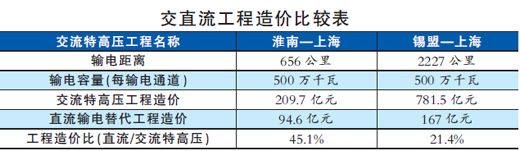 優(yōu)勢(shì)一:在電壓相近的條件下,直流的一極輸電線與交流特高壓的每相輸電線的輸電效果相近,架空線部分的直流輸電造價(jià)至少節(jié)約2/3。