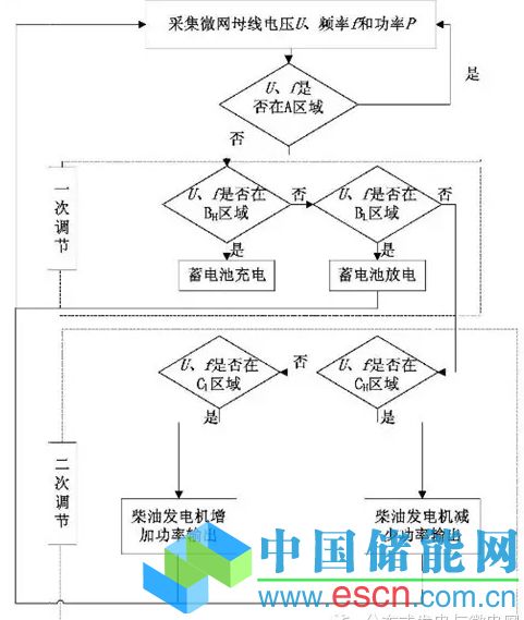 (3)若U、f處于A區(qū)域,則蓄電池儲(chǔ)能系統(tǒng)和柴油發(fā)電機(jī)組不參與調(diào)節(jié);若U、f處于B區(qū)域,負(fù)責(zé)一級(jí)控制的蓄電池儲(chǔ)能系統(tǒng)參與調(diào)節(jié)以實(shí)現(xiàn)系統(tǒng)功率平衡;若U、f處于C區(qū)域,則二級(jí)控制的柴油發(fā)電機(jī)參與調(diào)節(jié)以實(shí)現(xiàn)系統(tǒng)功率平衡;