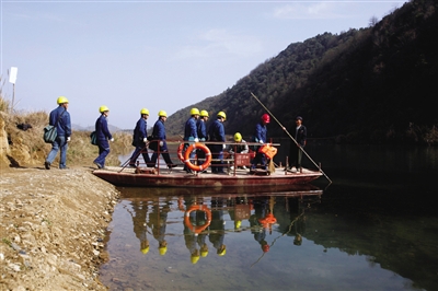 安徽省池州市東至縣山區(qū)線路段,巡線小分隊(duì)乘坐擺渡船過河進(jìn)山巡查線路。