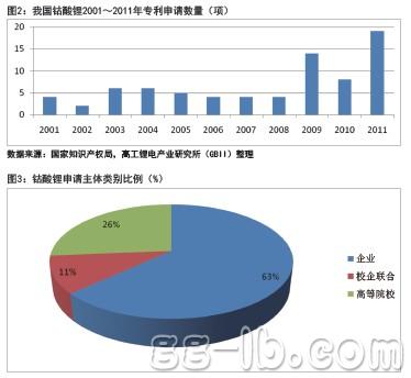 雖然在學(xué)術(shù)研究領(lǐng)域,鎳鈷錳酸鋰、錳酸鋰、磷酸鐵鋰的熱度要遠(yuǎn)高于鈷酸鋰,但是根據(jù)國家知識(shí)產(chǎn)權(quán)局發(fā)布的數(shù)據(jù)表明,鈷酸鋰近三年的專利申請(qǐng)數(shù)量急劇上升,自從2001年以來有80項(xiàng)關(guān)于鈷酸鋰的技術(shù)專利申請(qǐng),其中發(fā)明專利77項(xiàng),實(shí)用新型專利 3項(xiàng),2009~2011年三年申請(qǐng)數(shù)量占54%,超過了前8年申請(qǐng)量的總和(圖2)。
