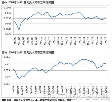 根據(jù)國家外匯交易中心的公開交易數(shù)據(jù)表明,自從2009年1月份以來韓元兌人民幣升值7.39%(圖4),日元兌人民幣升值9.4%(圖5)。這意味著在采購價(jià)格不變的情況下,受益于匯率因素,如果按照日韓企業(yè)每年從中國進(jìn)口鈷酸鋰材料6000噸計(jì)算,韓國和日本鋰離子電芯廠平均一年可以降低3%左右的正極材料采購成本,合計(jì)每年可以節(jié)約3000多萬人民幣。