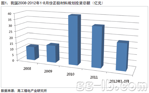 投資漸趨理性2008年以來我國正極材料規(guī)劃投資總額達121億元,其中2008~2012年1~8月份分別為11.5億元、14.5億元、40億元、33億元和22億元(圖1)。