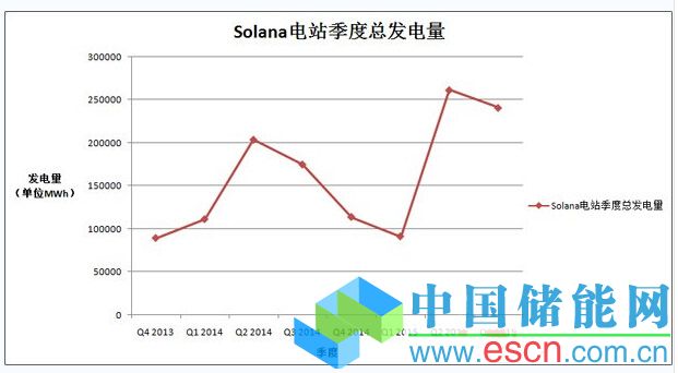 因2015年12月份的數(shù)據(jù)尚未更新,我們暫且大概推算一下兩大電站在2015年度的全年發(fā)電量。Solana電站2015年10月和11月的發(fā)電量分別為49469MWh和46262MWh。粗略估算,Solana電站2015年度總發(fā)電量約為738405MWh。相對2014年全年的603567MWh,發(fā)電量增長約22.3%。2015年的年發(fā)電量達(dá)到其預(yù)期發(fā)電能力的78.22%。