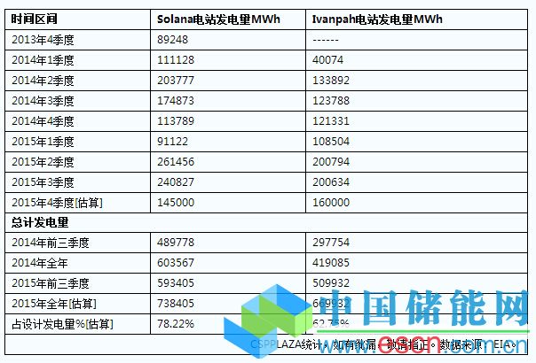 2015年10月和11月,Ivanpah1號電站的發(fā)電量分別為11813MWh和16230MWh。Ivanpah2號電站發(fā)電量分別為12477MWh和22222MWh。Ivanpah3號電站發(fā)電量分別為12681MWh和22022MWh。粗略估算,Ivanpah電站2015年度總發(fā)電量約為669932MWh。相較2014年全年的419085MWh,發(fā)電量增長約60%。2015年的年發(fā)電量達(dá)到其預(yù)期設(shè)計發(fā)電能力的62.75%。