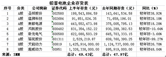 中國儲能網(wǎng)訊:上海有色網(wǎng)(SMM)對上市公司中報整理發(fā)現(xiàn),上半年8家鉛蓄電池企業(yè)存貨高達49.43億,而其上半年凈利總和僅為10.67億元,存貨相當于凈利的4.65倍。由此可見,下半年鉛蓄電池企業(yè)去庫存壓力仍然很大。