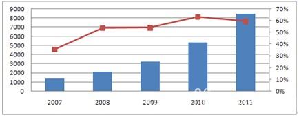 圖1:2007年~2011年中國(guó)三元材料產(chǎn)量統(tǒng)計(jì)(噸)