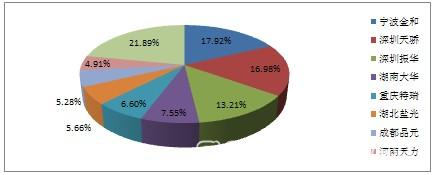 從產(chǎn)量排名看,前五名的廠家是寧波金和、深圳天驕、深圳振華、湖南大華和重慶特瑞,他們的產(chǎn)量分別是950噸、900噸、700噸、400噸和350噸;前五名廠家占全國(guó)三元材料產(chǎn)量比例為62.83%(圖5)。金和、天驕和振華“三巨頭”依然占據(jù)我國(guó)三元材料市場(chǎng)的大部分份額,但是市場(chǎng)競(jìng)爭(zhēng)格局卻發(fā)生明顯變化:1、寧波金和在產(chǎn)量上首次超越深圳天驕,成為三元材料產(chǎn)量第一的廠家,寧波金和主要得益于ATL的訂單;2、深圳天驕實(shí)際控制人更迭,對(duì)公司的發(fā)展造成一定影響,導(dǎo)致公司增長(zhǎng)速度落后于寧波金和。隨著控制權(quán)花落廈門市帛石貿(mào)易有限公司,深圳天驕或?qū)⑦M(jìn)入正常發(fā)展軌道;3、河南思維由于各方面原因在2012年初的時(shí)候轟然倒下,從而在三元材料廠家名錄中消失,河南力天接手了他們的部分客戶。4、湖南大華由于開拓了精進(jìn)能源等客戶,使得產(chǎn)量有了明顯的提升,是2012年三元材料市場(chǎng)最大的黑馬;5、河南福森、河南科隆、河南紅日、河南天力等一批河南三元材料企業(yè)正在崛起,隨著市場(chǎng)認(rèn)可度的提高,他們的市場(chǎng)影響力不容忽視。