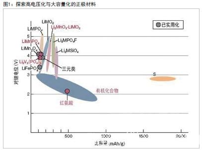 現(xiàn)有鋰離子充電電池的正極材料使用的是鈷酸鋰( L i C o O 2) 、三元類( L i N i M n C o O 2 ) 、錳酸鋰( L i M n 2 O 4 ) 、磷酸鐵鋰(LiFePO4)等。但這些正極材料的理論容量都在200mAh/g以下。因此必須尋找超過(guò)200mAh/g的新材料,或是使用能夠?qū)⒛壳爸挥?V左右的對(duì)鋰電位提高到5V左右的5V類正極材料,增加能量密度*(圖1)。