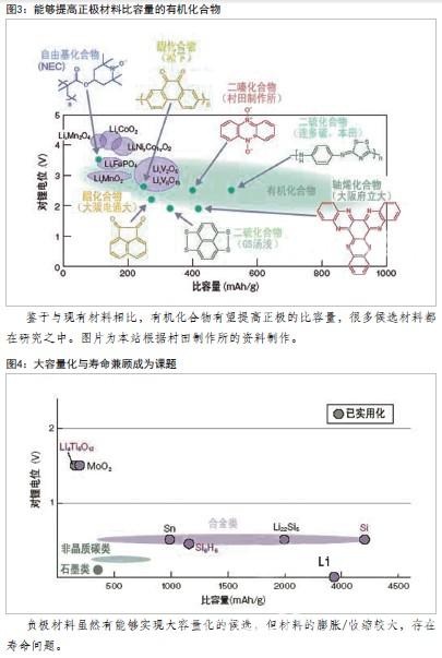 有機(jī)充電電池的正極材料使用有機(jī)化合物(圖3)。反應(yīng)機(jī)理與普通的鋰離子充電電池相同。有機(jī)充電電池的特點(diǎn)是不僅理論容量最大可接近1000mAh/g,而且不使用重金屬,重量較輕,資源限制也比較小。